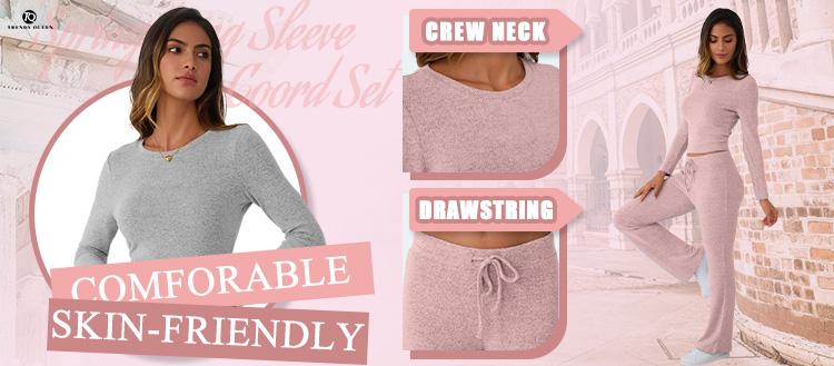 The slimming long sleeve top and stylish low-rise bell bottoms make this set ideal for both lounging and casual outings, doubling as trendy pajamas.